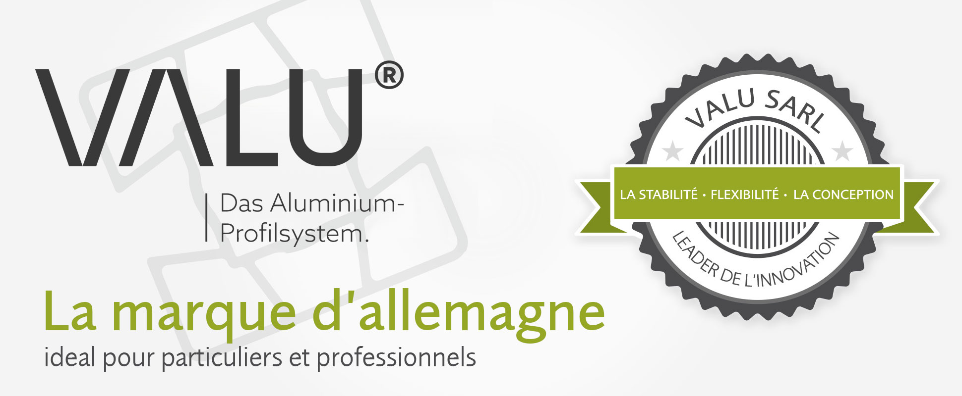 VALU est le synonyme de construction modulaire individuelle comme système clique. Les profilés de système sont multifonctionnels et pourront être combinés et élargis à tout moment avec des matériaux- selon la norme DIN – de serrurerie et clôture.